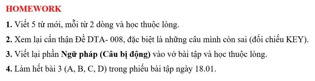 CHỦ NHẬT NGÀY 18/01/2025 - BTVN 9A