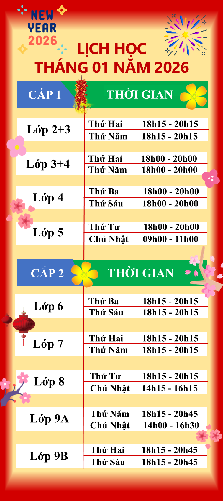 LỊCH HỌC THÁNG 01/2026