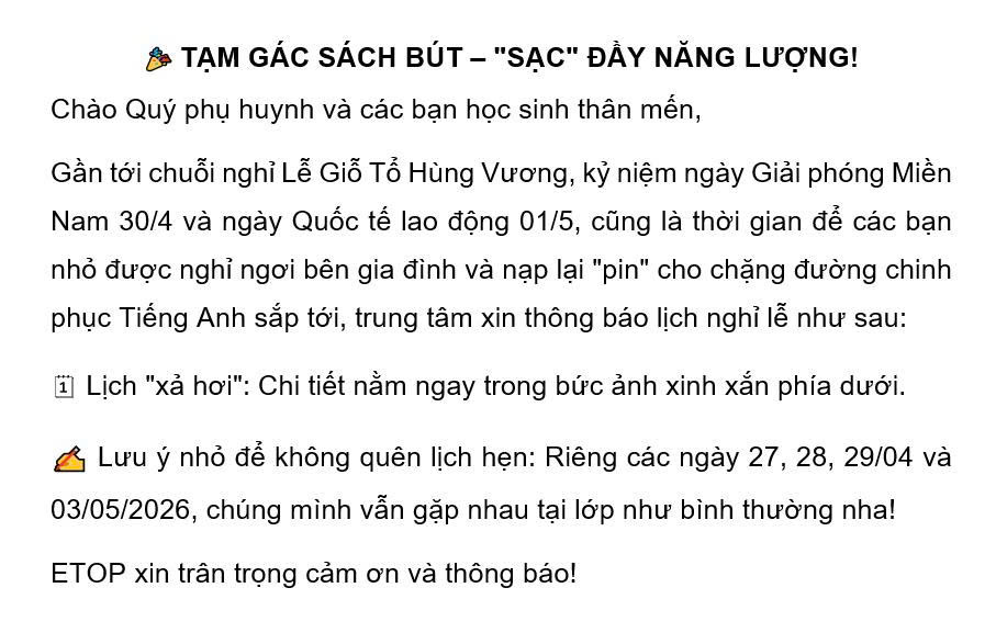 THÔNG BÁO NGHỈ GIỖ TỔ HÙNG VƯƠNG, GIẢI PHÓNG MIỀN NAM VÀ QUỐC TẾ LAO ĐỘNG 2026