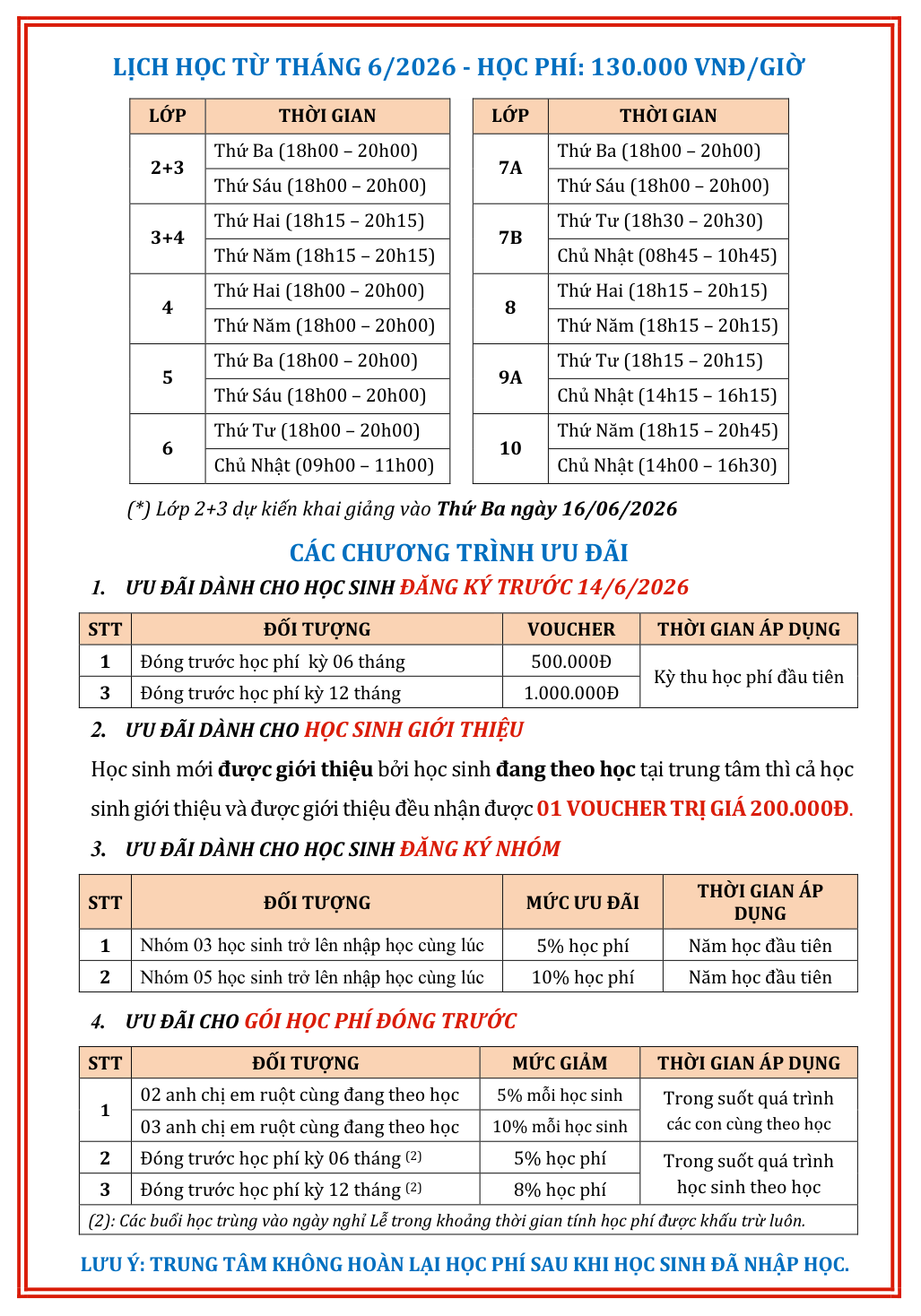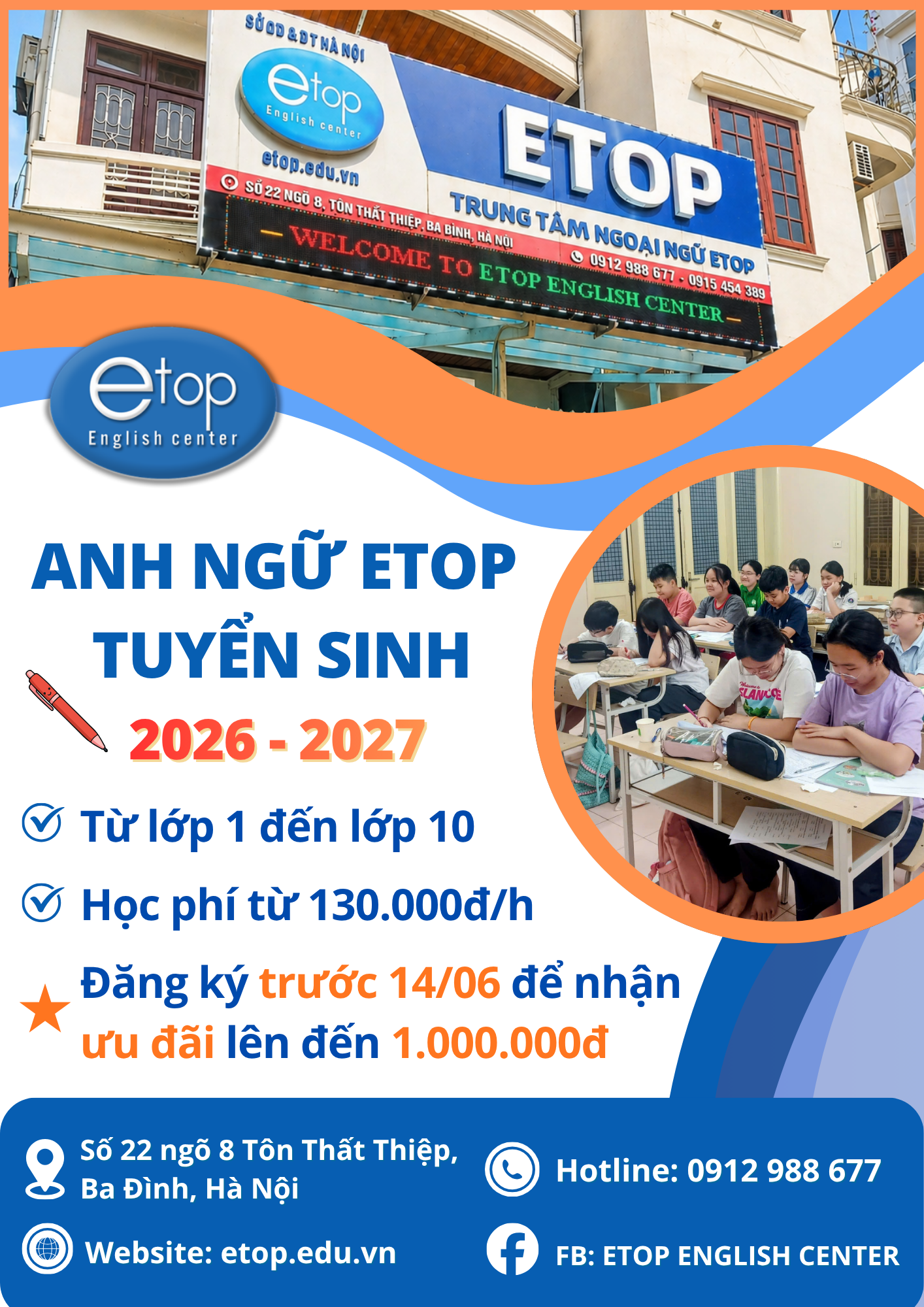 Trung tâm Anh ngữ ETOP chính thức tuyển sinh các lớp tiếng Anh từ tiểu học đến THPT. Môi trường học tập năng động, giáo trình chuẩn, cam kết tiến bộ rõ rệt và cơ sở vật chất luôn được đảm bảo để các em học sinh được học trong không gian thoáng mát, thoải mái.