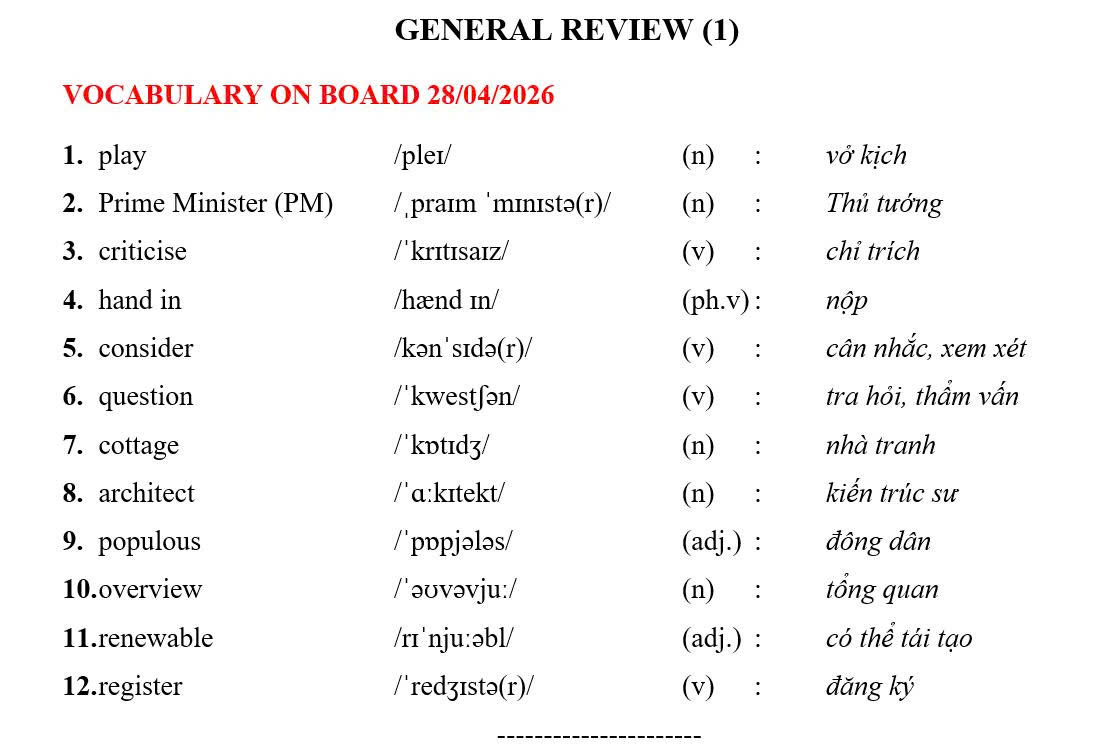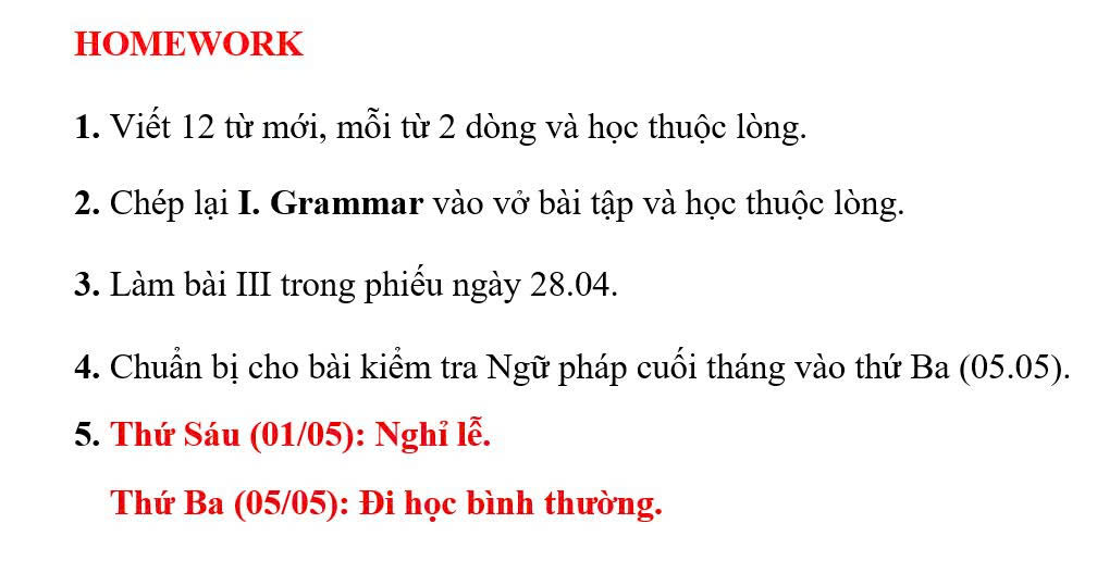 THỨ BA NGÀY 28/04/2026 - BTVN 6A
