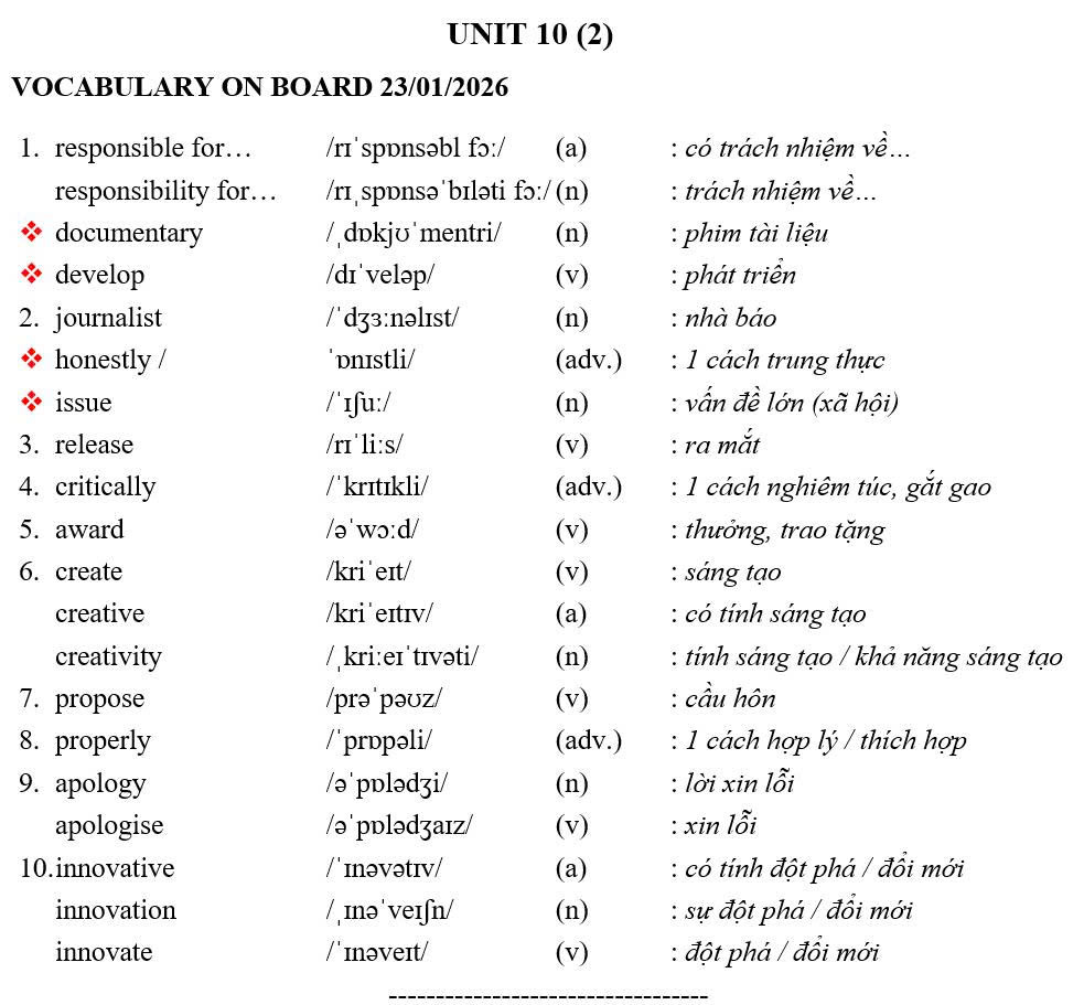 THỨ HAI NGÀY 26/01/2026 - BTVN 9B