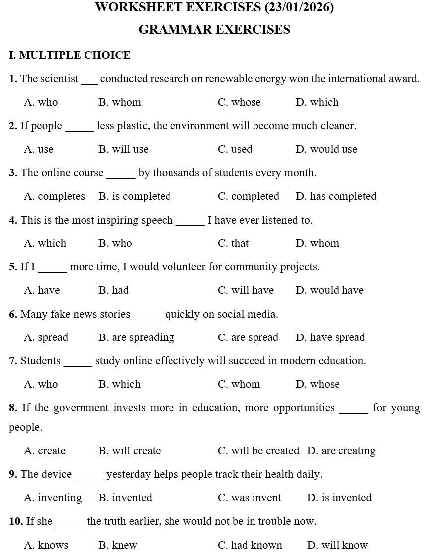 THỨ SÁU NGÀY 23/01/2026 - BTVN 9B