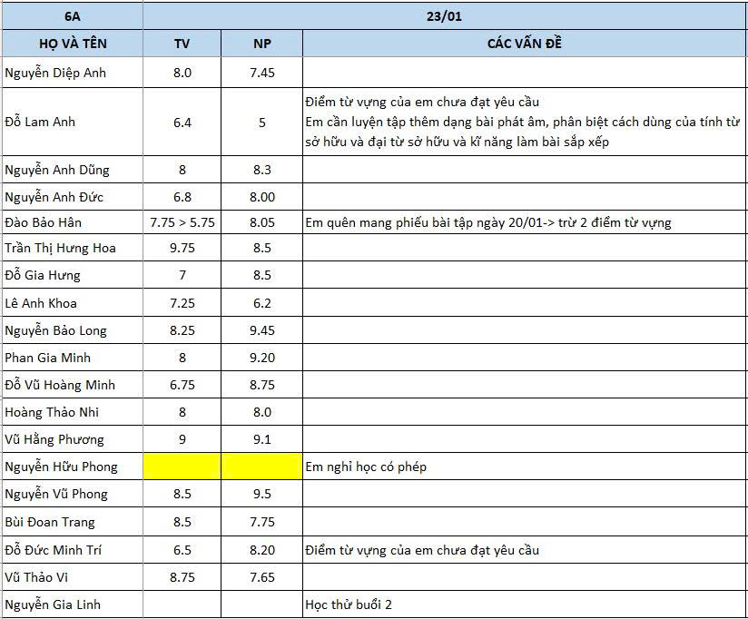 THỨ BA NGÀY 20/1/2026 - QLHS LỚP 6A