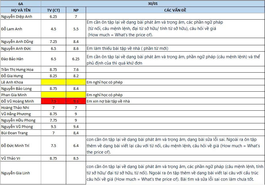THỨ BA NGÀY 20/1/2026 - QLHS LỚP 6A