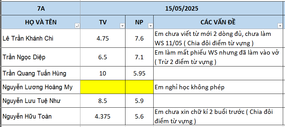 THỨ NĂM NGÀY 15/05/2025 - QLHS 7A